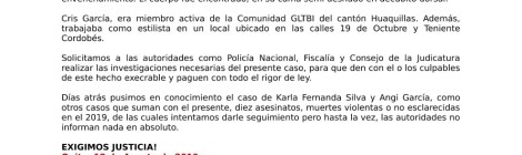 Boletín de Prensa Nueva muerte violenta de mujer trans no esclarecida en El Oro, Ecuador.